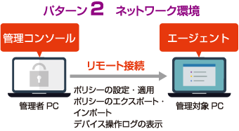 RunDXは管理対象PCのエージェントにポリシーなどを適応させる際、管理サーバーを用意しなくても管理用ツール(無償)を使い