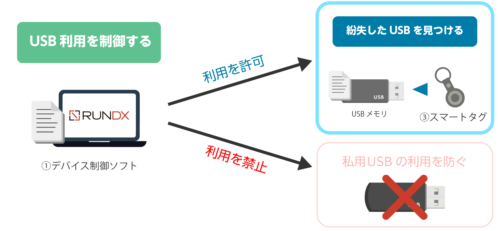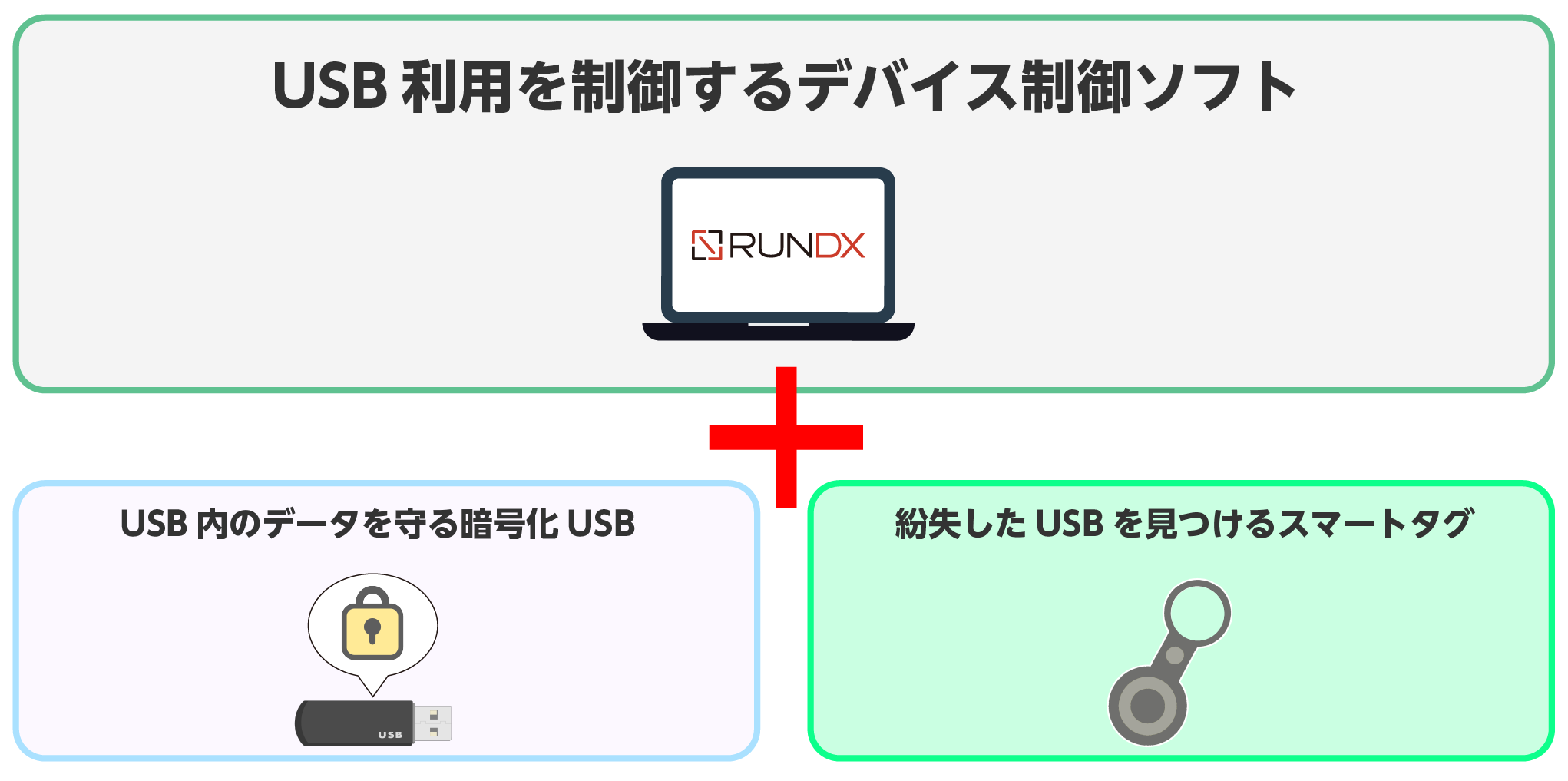 デバイス制御ソフト + 暗号化USB + スマートタグ